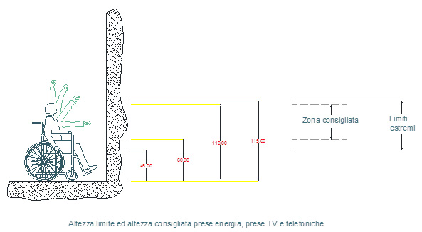Tutte le apparecchiature elettriche, quali, punti di comando, di controllo, di protezione, prese di corrente ecc., devono essere installate ad una distanza idonea al loro utilizzo, come di seguito schematizzato.