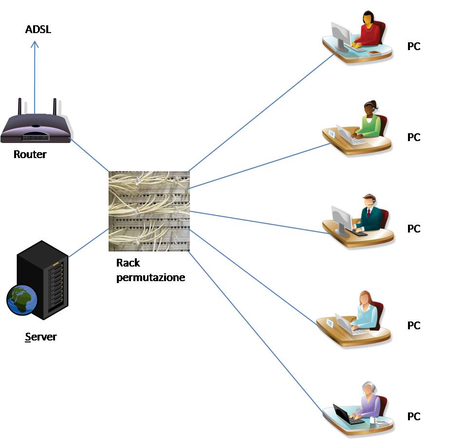 Impianti trasmissione dati - cablaggio strutturatoIl cablaggio strutturato (o rete LAN Local Area Network) è un tipo di impianto che permette il collegamento di vari computer ad una rete locale di trasmissione dati. Ogni utente può collegare il proprio computer, oppure il telefono o addirittura il fax, tramite specifiche prese collegate singolarmente mediante appositi cavi in rame o in fibra ottica, ad un armadio chiamato rack dentro il quale trovano posizione alcuni pannelli di permutazione denominati patch panel, necessari per il collegamento delle apparecchiature situate all’altro capo delle linee dati. I componenti dell’impianto trasmissione dati sono: cavi in rame o fibra ottica, prese terminali nei vari punti predisposti del tipo plug ad 8 pin, armadi rack, contenenti i vari pannelli di permutazione, apparati attivi quali hub e switch, i quali servono per il “colloquio” tra gli apparati collegati in rete, vengono connessi ai pannelli di permutazione mediante appositi cavi chiamati patch cord, apparati di internet working denominati router necessari per la connessione della rete nella navigazione in internet. Questo semplicissimo esempio per far comprendere il vantaggio di un impianto versatile per molte applicazioni, per quanto riguarda l’ambiente terziario e industriale, non solo, ma anche l’ambiente civile. Al giorno d’oggi anche negli ambienti civili si utilizzano impianti di trasmissione dati, per poter allacciare le più svariate apparecchiature in un'unica rete a livello domestico. |